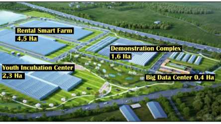 Smart farm Area yang disewakan, para petani muda dikelompokkan sebanyak 3 orang per tim, dan dibentuk 10 tim untuk menyewa lokasi greenhouse di area ini. Petani muda tersebut diharapkan bekerja didalam tim dan didampingi seorang fasilitator ahli untuk melakukan agribisnis smart greenhouse secara riil mulai dari produksi sampai pemasaran.