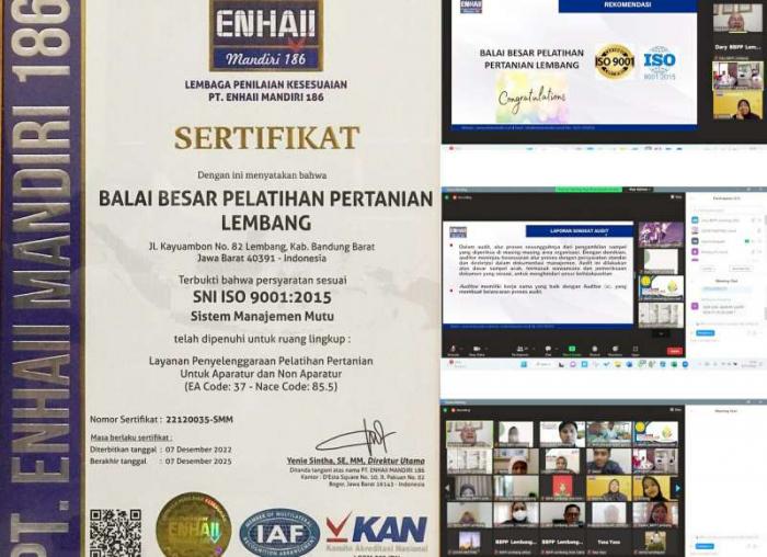 Balai Besar Pelatihan Pertanian (BBPP) Lembang memperoleh sertifikat ISO 9001:2015 tentang Sistem Manajemen Mutu, yang dikeluarkan oleh Lembaga Penilaian Kesesuaian, PT. Enhaii Mandiri 186. BBPP Lembang telah memenuhi ruang lingkup Layanan Penyelenggaraan Pelatihan Pertanian bagi Aparatur dan Non Aparatur. Sertifikat berlaku dari 7 Desember 2022 hingga 7 Desember 2025_