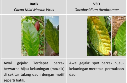 Swadayaonline.com - Penyakit Batik, nama khas yang diberikan petani ini memiliki gejala klorosis yang terjadi di dekat tulang daun nampak bertepi tegas dan bercorak seperti batik dengan warna yang cukup tajam. Awalnya penyakit ini diduga sebagai Vascular Streak Dieback (VSD), namun daun-daun pada ranting tidak meranggas sebagian (ompong) dan jika tangkai daun dipatahkan tidak terdapat noktah tiga di penampangnya, dan jika ranting dibelah tidak terdapat bercak pembuluh di sepanjang ranting tersebut (tabel 1). Bunga gagal terbentuk akibat penyakit ini, sehingga produksi kakao menurun drastis.